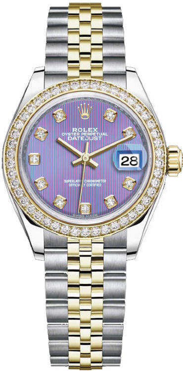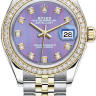 Элегантная классика из модельного ряда Datejust от Rolex для женщин. Часы в превосходном исполнении идеально сочетают в себе гармонично созданный дизайн и передовые часовые технологии. Инкрустация бриллиантами превращает элегантные часы в изысканное украшение. Изготовленный из нержавеющей стали и желтого золота корпус часов, имеет размер 28 мм. Механизм с автоматическим подзаводом работает от амплитуды движения руки. Часы предназначены для того, чтобы в них плавали и имеют водонепроницаемость 100 м. Циферблат закрыт прозрачным антибликовым стеклом из сапфирового хрусталя высокой прочности, благодаря чему обеспечивается максимальная защита от сколов и механических повреждений. Часы укомплектованы стальным браслетом с застежкой , превосходно дополняющим эксклюзивный образ модели. 56 бриллиантов. Калибр 2236. Запас хода до 55 часов. Циферблат с фиолетовыми и розовыми полосками.Гарантия и комплектация