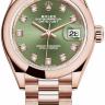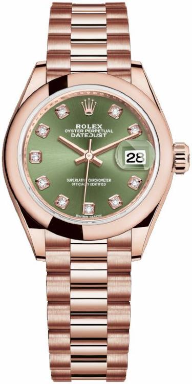 Изысканные женские часы, украшенные роскошными бриллиантами, от Rolex являются образцами классического стиля. Завершенные линии, гармоничное сочетание мельчайших деталей, высококачественные материалы и ярко выраженная индивидуальность каждой модели привлекают истинных поклонников имиджевых аксессуаров. Изготовленный из розового золота 18 карат корпус часов, имеет размер 28 мм. Механизм с автоматическим подзаводом работает от амплитуды движения руки. Часы предназначены для того, чтобы в них плавали и имеют водонепроницаемость 100 м. Циферблат закрыт прозрачным антибликовым стеклом из сапфирового хрусталя высокой прочности, благодаря чему обеспечивается максимальная защита от сколов и механических повреждений. Модель поставляется на золотом браслете с раскладывающейся золотой застежкой. Бриллианты 10 шт. Калибр 2236. Запас хода до 55 часов. Циферблат зеленый.Гарантия и комплектация