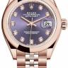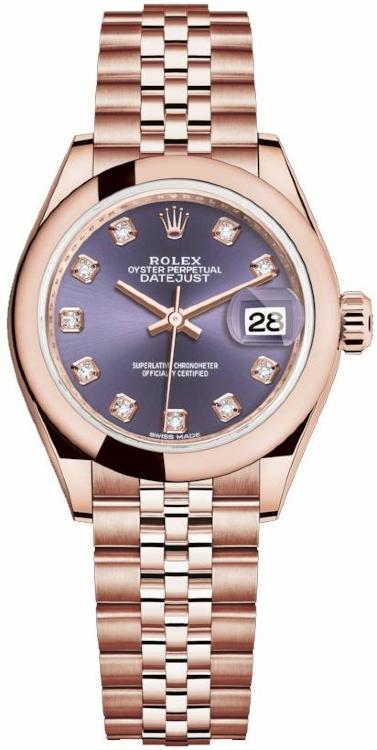Строгость, элегантность, лаконичность, простота и изысканность форм в сочетании с непревзойденным качеством являются основными характеристиками женских наручных часов компании Rolex. Инкрустация бриллиантами превращает элегантные часы в изысканное украшение. Часы произведены в золотом корпусе размером 28 мм. Механизм с автоматическим подзаводом работает от амплитуды движения руки. Часы предназначены для того, чтобы в них плавали и имеют водонепроницаемость 100 м. Циферблат закрыт прозрачным антибликовым стеклом из сапфирового хрусталя высокой прочности, благодаря чему обеспечивается максимальная защита от сколов и механических повреждений. Браслет выполнен из розового золота и комплектуется раскладывающейся золотой застежкой. Бриллианты 10 шт. Калибр 2236. Запас хода до 55 часов. Циферблат фиолетовый.Гарантия и комплектация
