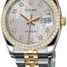 Уникальные, потрясающие женские часы от Rolex коллекции Datejust станут настоящим подарком для истинных поклонников классики и традиций, которые прошли сквозь десятилетия. Инкрустация бриллиантами превращает элегантные часы в изысканное украшение и они гармонично дополнят образ своего обладателя и подчеркнут его индивидуальность и изысканный вкус. Часы выполнены в корпусе из нержавеющей стали и желтого золота размером 36 мм. Толщина корпуса составляет 11 мм. Механизм с автоматическим подзаводом работает от амплитуды движения руки. Часы предназначены для того, чтобы в них плавали и имеют водонепроницаемость 100 м. Циферблат закрыт прозрачным антибликовым стеклом из сапфирового хрусталя высокой прочности, благодаря чему обеспечивается максимальная защита от сколов и механических повреждений. Браслет, изготовленный из нержавеющей стали и желтого золота с раскладывающейся застежкой стальной, выполнен в строгом стиле и воплощает элегантность. Бриллианты 62 шт. Запас хода до 48 часов.Гарантия и комплектация