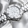 Женские часы родом из Швейцарии. Производитель TAG Heuer исполнил эксклюзивную кварцевую модель в светлых тонах с изысканным сочетанием зеркальной стали и керамики белого цвета на зафиксированной безели. Диаметр равен 41 мм, его толщина 12, 5 мм. В области белых вставок инкрустирован бриллиантами в количестве 12 штук по 0,09 карата каждый. Браслет из полированной стали оснащен надежной раскладной застежкой. Задняя поверхность легко откручивается. Хронограф имеет водонепроницаемость в 200 метров.Гарантия и комплектация