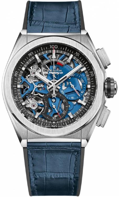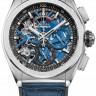 Хронограф от Zenith для стильных мужчин. Дизайн данной модели определяет статус своего обладателя и часы становятся неотъемлемой составляющей образа современного человека. Эти часы являются эксклюзивным аксессуаром для мужчин, которые хотят подчеркнуть свою целеустремленность и активную жизненную позицию. Изготовленный из титана корпус часов, имеет размер 44 мм. Механизм с автоматическим подзаводом работает от амплитуды движения руки. Часы предназначены для того, чтобы в них плавали и имеют водонепроницаемость 100 м. Циферблат закрыт прозрачным антибликовым стеклом из сапфирового хрусталя высокой прочности, благодаря чему обеспечивается максимальная защита от сколов и механических повреждений. Благодаря прозрачной задней крышке корпуса можно увидеть практически все детали превосходного механизма и получать эстетическое наслаждение, глядя на его слаженную работу. Модель поставляется на каучуковом ремешке с раскладывающейся титановой застежкой. Хронограф. Скелетон. Индикатор запаса хода. Калибр El Primero 9004. Запас хода до 50 часов. Циферблат синий. Прозрачная задняя крышка.Гарантия и комплектация