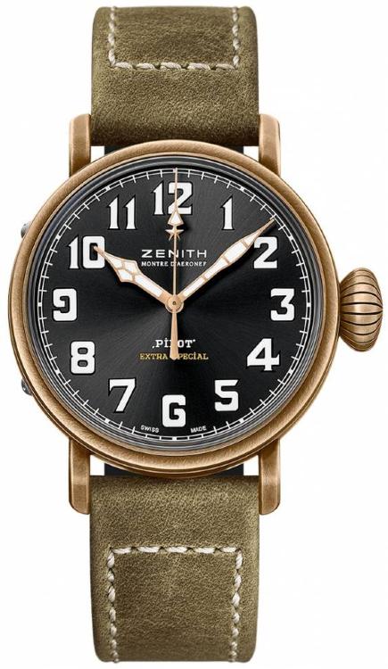 Прогрессивные технологии часов удивительным образом переплетаются с устоявшимся традиционным дизайном модельного ряда Pilot, присущим часам от компании Zenith. Эта изысканная модель будет превосходно смотреться на запястье. Модель поставляется в корпусе размером 40 мм. Корпус часов толщиной 12,95 мм. Механизм с автоматическим подзаводом работает от амплитуды движения руки. Часы предназначены для того, чтобы в них плавали и имеют водонепроницаемость 100 м. Циферблат закрыт прозрачным антибликовым стеклом из сапфирового хрусталя высокой прочности, благодаря чему обеспечивается максимальная защита от сколов и механических повреждений. Модель поставляется на кожаном ремешке с простой титановой застежкой. Калибр Elite 679. Запас хода до 50 часов. Корпус из бронзы. Ремешок из нубука с водоотталкивающим покрытием и подкладкой из каучука. Циферблат черный.Гарантия и комплектация