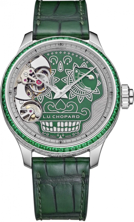 | Дополнение | Ограниченная серия (Limited Edition). Изумруды багетной огранки на безеле. Репетир. Скелетон. Индикатор запаса хода. Калибр LUC 08.01-L. Запас хода до 60 часов. Циферблат зеленый. Задняя крышка с сапфировым стеклом. |