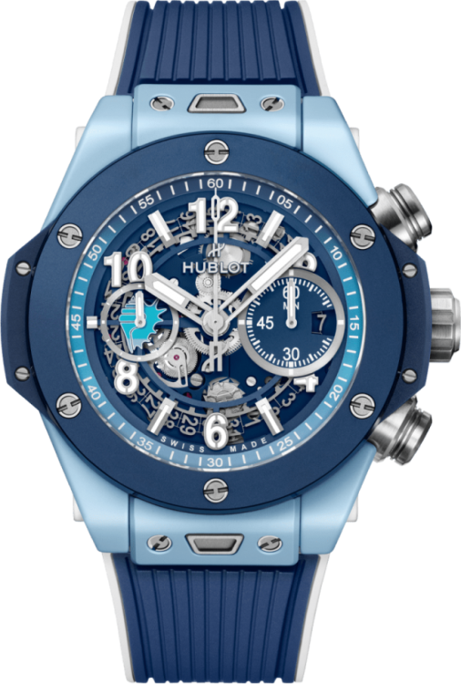 | Дополнение | Хронограф. Скелетон. Калибр HUB1280. Запас хода до 72 часов. Циферблат синий. Задняя крышка с сапфировым стеклом. В комплект входят два ремешка из каучука: синий и голубой, оснащенные системой быстрой замены. |