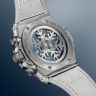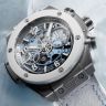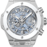 | Дополнение | Ограниченная серия (Limited Edition) 200 шт. Хронограф. Скелетон. Калибр HUB1280. Запас хода до 72 часов. Циферблат голубой. Задняя крышка с сапфировым стеклом. В комплект входят два ремешка из каучука и телячьей кожи: белый и голубой, оснащенные системой быстрой замены. Корпус из титана и керамики. |