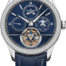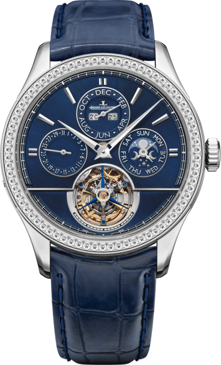 Прогрессивные технологии часов удивительным образом переплетаются с устоявшимся традиционным дизайном модельного ряда Master, присущим часам от компании Jaeger-LeCoultre. Эта изысканная модель будет превосходно смотреться на запястье. Модель поставляется в платиновом корпусе размером 42 мм. Корпус часов толщиной 13,27 мм. Механизм с автоматическим подзаводом работает от амплитуды движения руки. Часы с водонепроницаемостью 30 м перенесут небольшое случайное попадание воды. Циферблат закрыт прозрачным антибликовым стеклом из сапфирового хрусталя высокой прочности, благодаря чему обеспечивается максимальная защита от сколов и механических повреждений. Модель поставляется на кожаном ремешке с простой платиновой застежкой. 72 бриллианта круглой огранки общим весом 3,4 карата. Турбийон. Вечный календарь. Калибр 985. Запас хода до 45 часов. Циферблат синий. Задняя крышка с сапфировым стеклом.Гарантия и комплектация