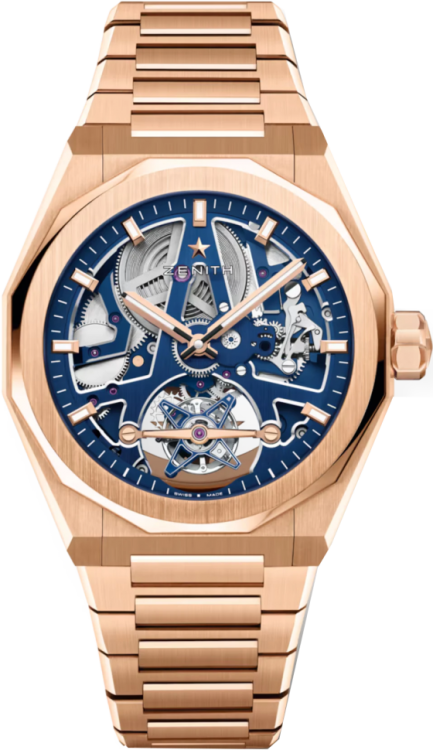 | Дополнение | Ограниченная серия (Limited Edition) 50 шт. Турбийон. Скелетон. Калибр El Primero 3630SK. Запас хода до 60 часов. Циферблат синий. Задняя крышка с сапфировым стеклом. В комплект входят браслет из розового золота и синий ремешок из каучука, оснащенные системой быстрой замены. |